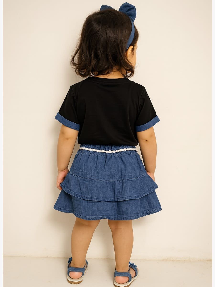 Dress your little one in this adorable girls cotton top and skirt co-ord set, perfect for 3-year-old toddlers. The black top features a cute cartoon bunny print with playful “Too Hip to Hop” text and denim-style sleeve accents, paired with a blue denim-look skirt adorned with floral embroidery and a white rope belt. Made from soft, breathable fabric, this stylish outfit is ideal for everyday wear, birthday parties, or casual outings. Designed for comfort and easy movement, it’s a trendy addition to your girl’s wardrobe and perfect for Indian weather.