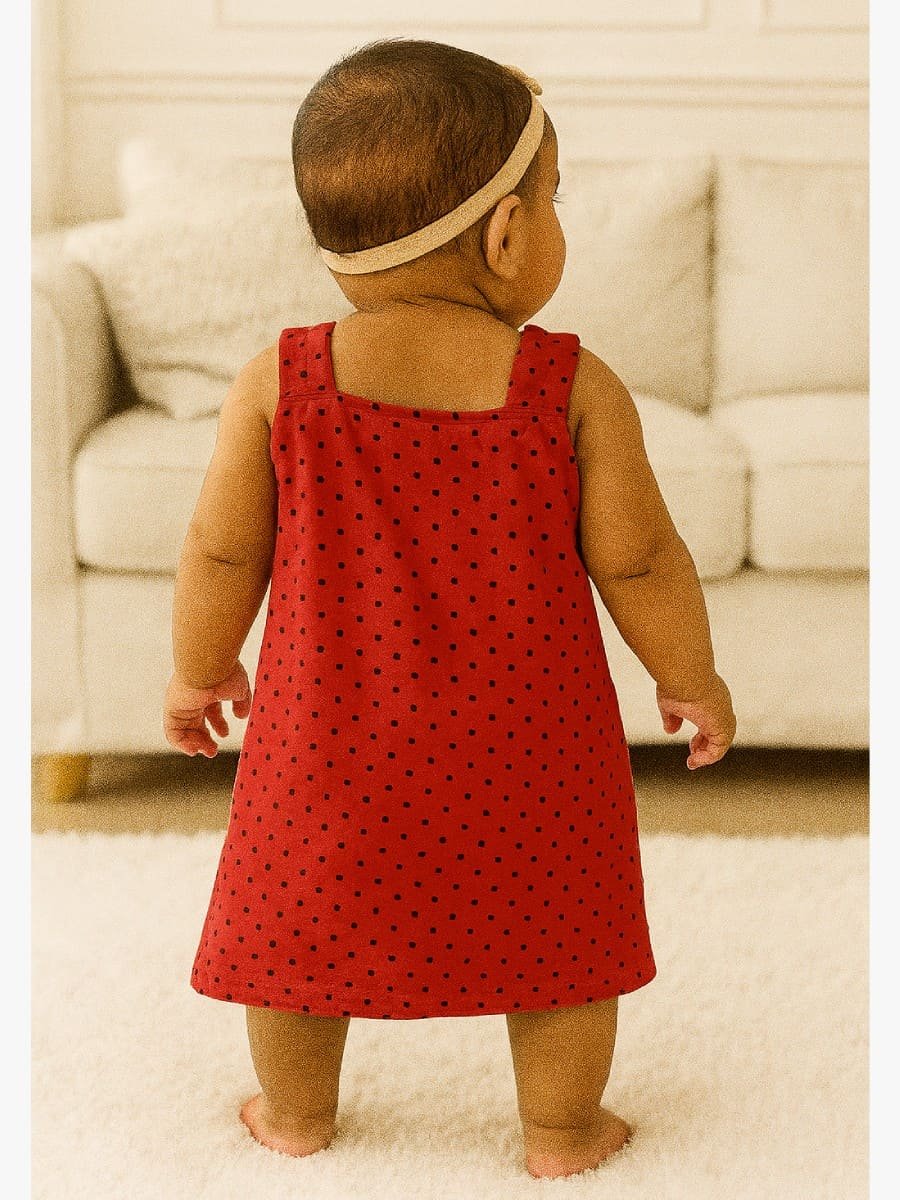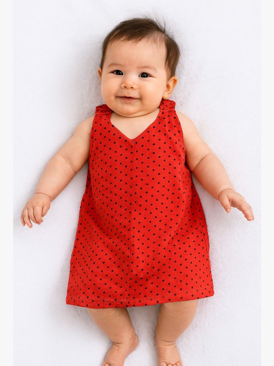 Dress your baby girl in timeless charm with this red polka dot cotton frock. Made from soft and breathable 100% cotton, this sleeveless frock features a neat V-neck and a comfortable A-line silhouette, making it ideal for both casual outings and cozy days indoors. The playful black polka dots add a fun, classic touch—perfect for girls aged 3–6 months.
