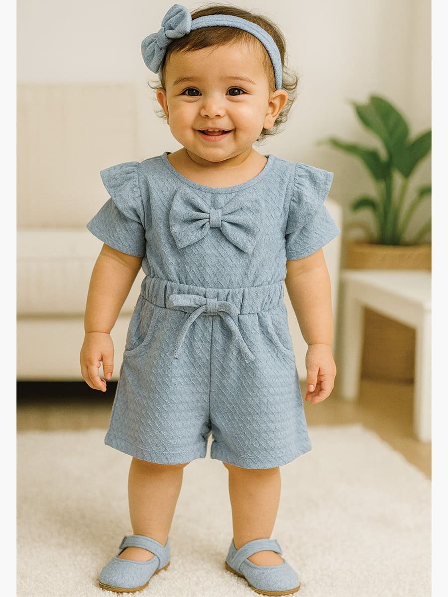 Dress your little one in this adorable Girls popcorn fabric romper in Ash Gray featuring a cute front bow design. Made from soft popcorn-textured fabric, this romper is perfect for casual wear, playtime, or outings. The short sleeves and elastic waist ensure comfort and easy movement. A trendy and breathable choice for baby girls that’s both stylish and practical.