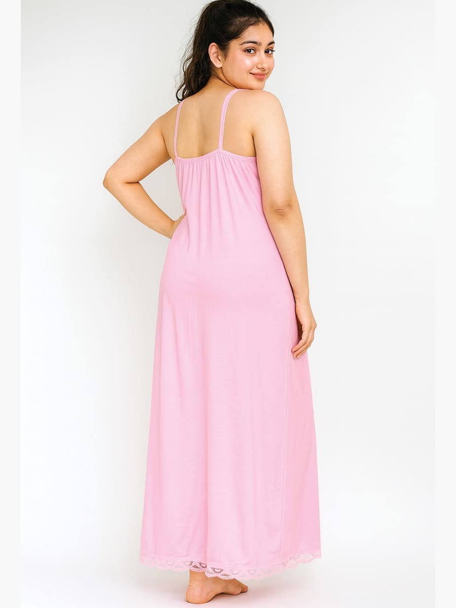 Women’s slip nightdress, cotton slip dress, lace slip nightgown, sleeveless slip nightie, V-neck nightdress, full-length slip nightgown, cotton night slip, comfortable sleepwear, Pink slip dress, layering slip for nightwear.