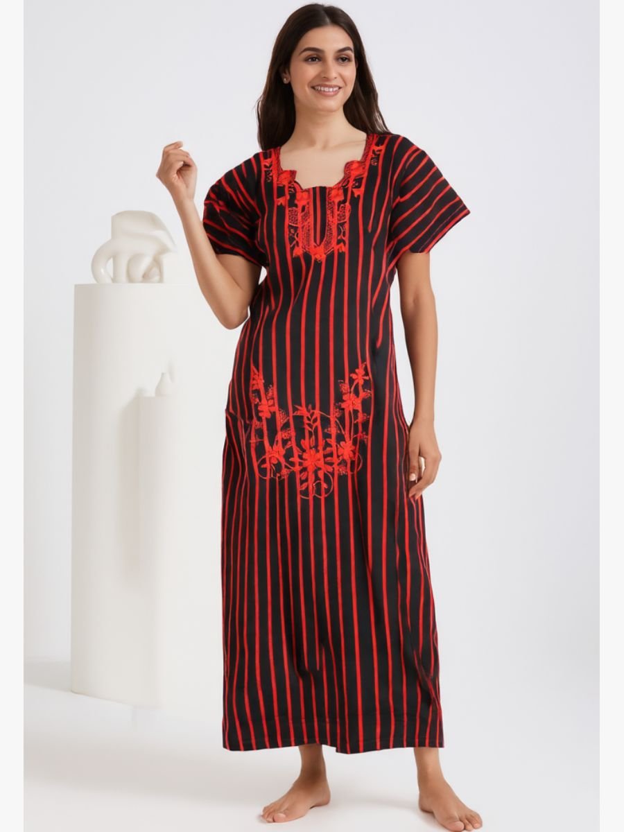 Add a blend of comfort and charm to your nightwear collection with this Red cotton nighty adorned with delicate floral embroidery. Made from soft, breathable 100% cotton, this nighty is designed to offer relaxed comfort throughout the night. The elegant sweetheart neckline complements the intricate floral detailing, while the half sleeves provide a breezy fit. Featuring a convenient front zipper for ease of wear and a side pocket for utility, this cotton nightwear is a must-have for every woman who values both style and functionality in her sleepwear.
