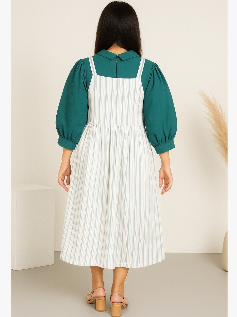 Make a bold and graceful fashion statement with this women’s layered A-line dress featuring a charming striped pinafore-style outer and a teal puff-sleeve shirt inner. The white and blue vertical stripes add a touch of vintage flair, while the shirt’s collared neck and golden button accent elevate its elegance. Made from breathable rayon fabric, this outfit is perfect for brunch dates, casual meetings, or a chic office look. Pair with block heels or flats for a polished ensemble.