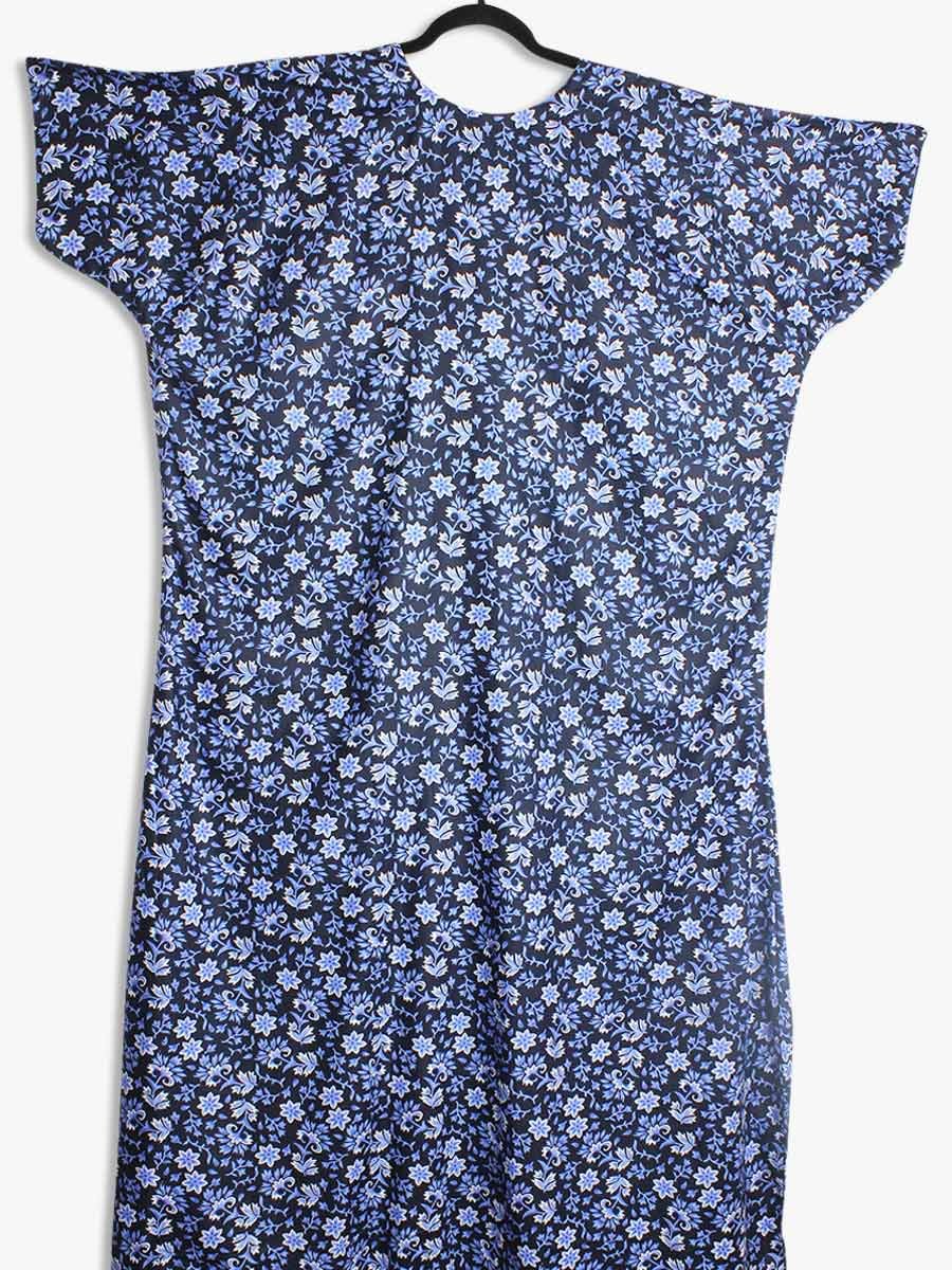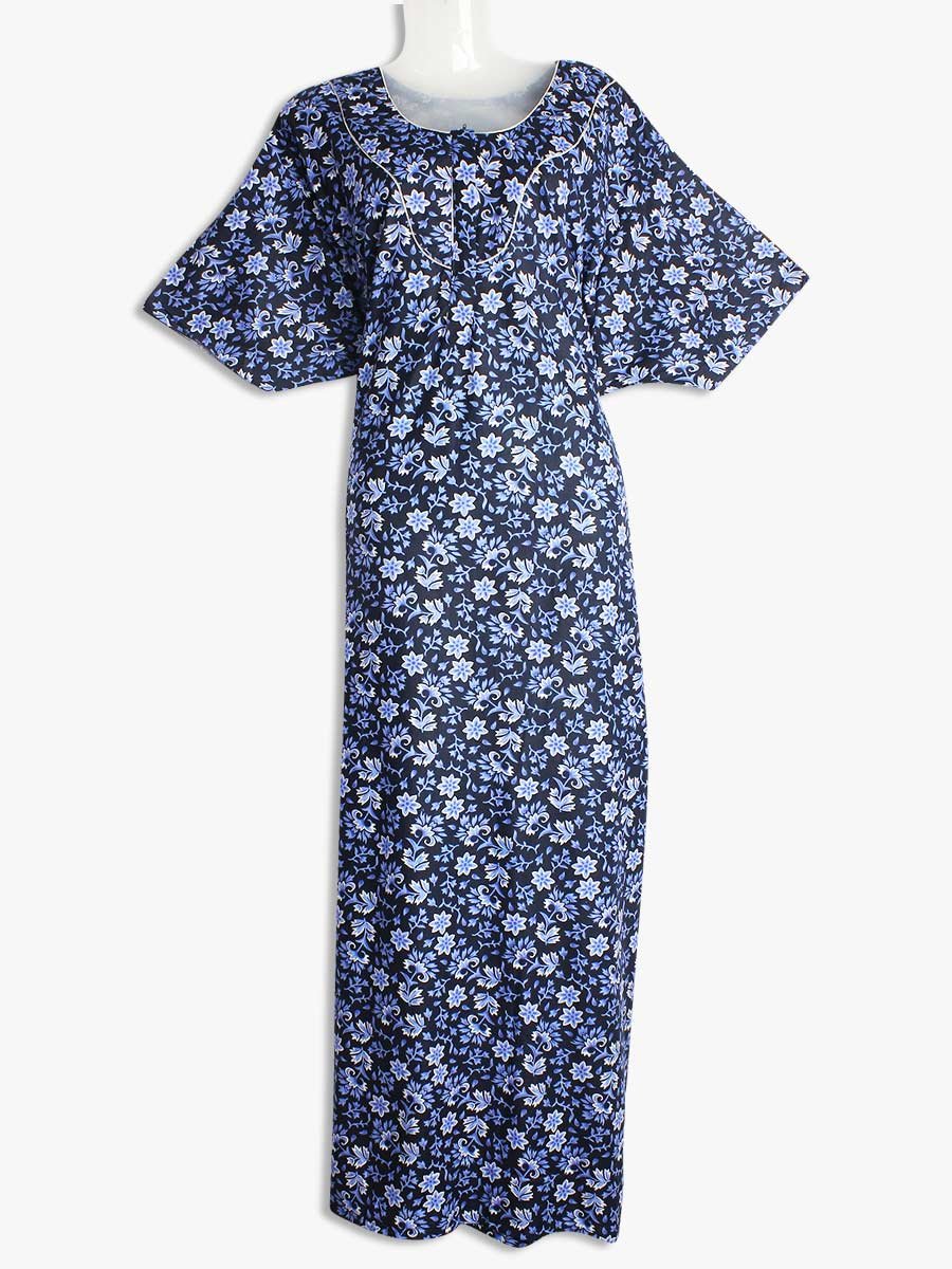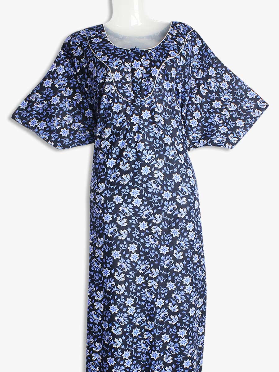 plus size cotton nighty, navy blue nighty, floral print nighty, cotton zipper nighty, boat neck nighty, nighty with side pocket, full-length cotton nightdress, plus-size sleepwear, zipper nighty for women, comfortable cotton nightwear, floral cotton nightgown