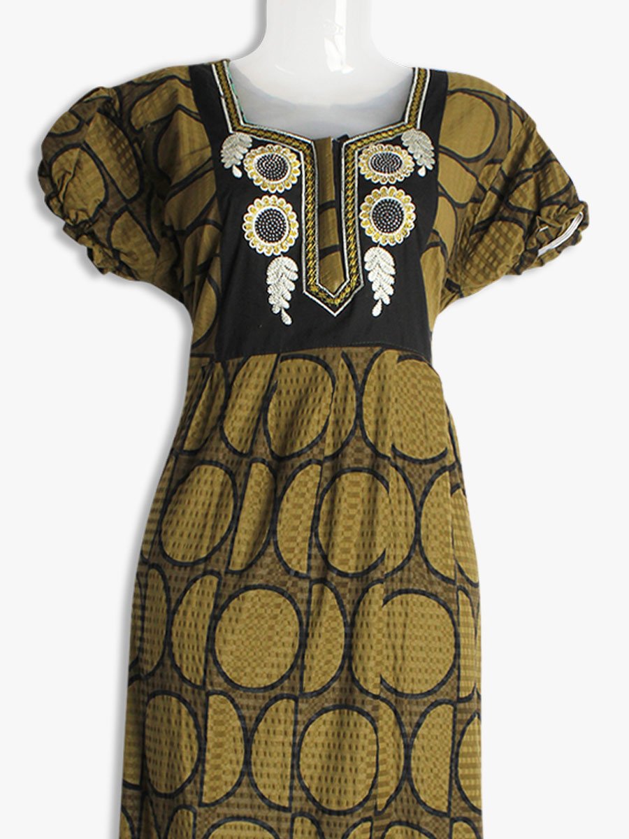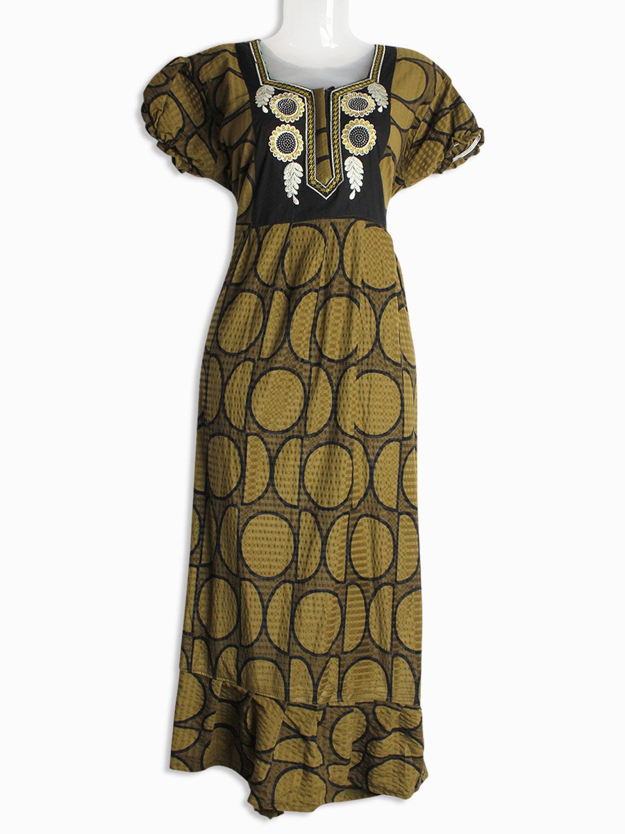 Experience ultimate comfort and elegance with this olive green embroidered frock nighty, crafted from soft popcorn fabric for a unique textured feel. Designed for style and ease, this nighty features puff sleeves for a feminine touch and a front zipper for convenience. Whether you’re lounging or sleeping, this comfortable and breathable nightdress ensures a relaxing experience all night long.