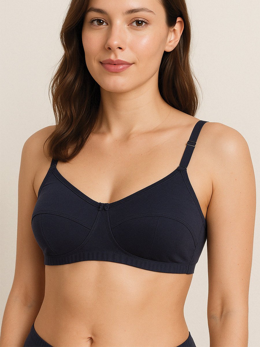 Elevate your essentials with this Navy blue Premium Cotton Bra for Women, where luxurious comfort meets functional design. Expertly crafted using fine Italian techniques, this bra provides a seamless fit with underwire elastic support for enhanced lift and shaping. The elegant racer back style ensures complete ease of movement—whether you’re on the go or winding down.