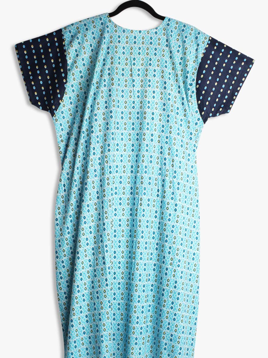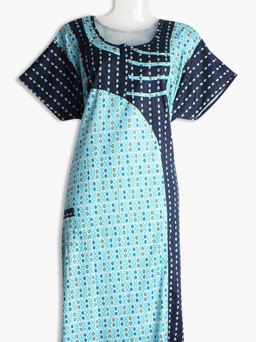 Experience ultimate comfort with this cotton zipper nighty in a soothing aqua shade with a stylish dotted print. Made from 100% breathable cotton, this night dress is soft, lightweight, and perfect for everyday sleepwear. The front zipper allows for easy wear, while the side pocket adds functionality. The relaxed fit and airy fabric ensure a comfortable and cozy night’s sleep. Ideal for lounging or bedtime, this cotton nightgown combines fashion and practicality effortlessly.