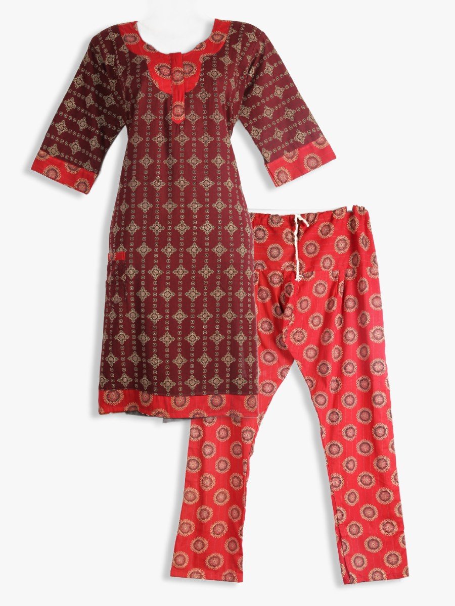 women cotton night suit, Ajrakh Cotton pajama set for women, printed nightwear, Maroon cotton nightwear, women’s night dress set, sleepwear set for women, cotton night dress combo, breathable cotton night suit, comfy cotton pajama