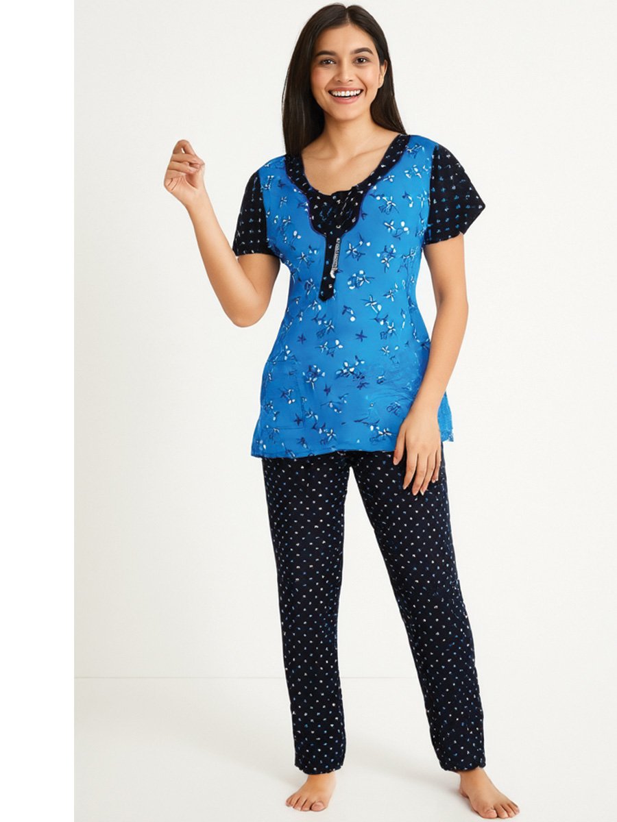 women cotton night suit, cotton pajama set for women, dotted print nightwear, Blue cotton nightwear, women’s night dress set, sleepwear set for women, cotton night dress combo, breathable cotton night suit, comfy cotton pajama
