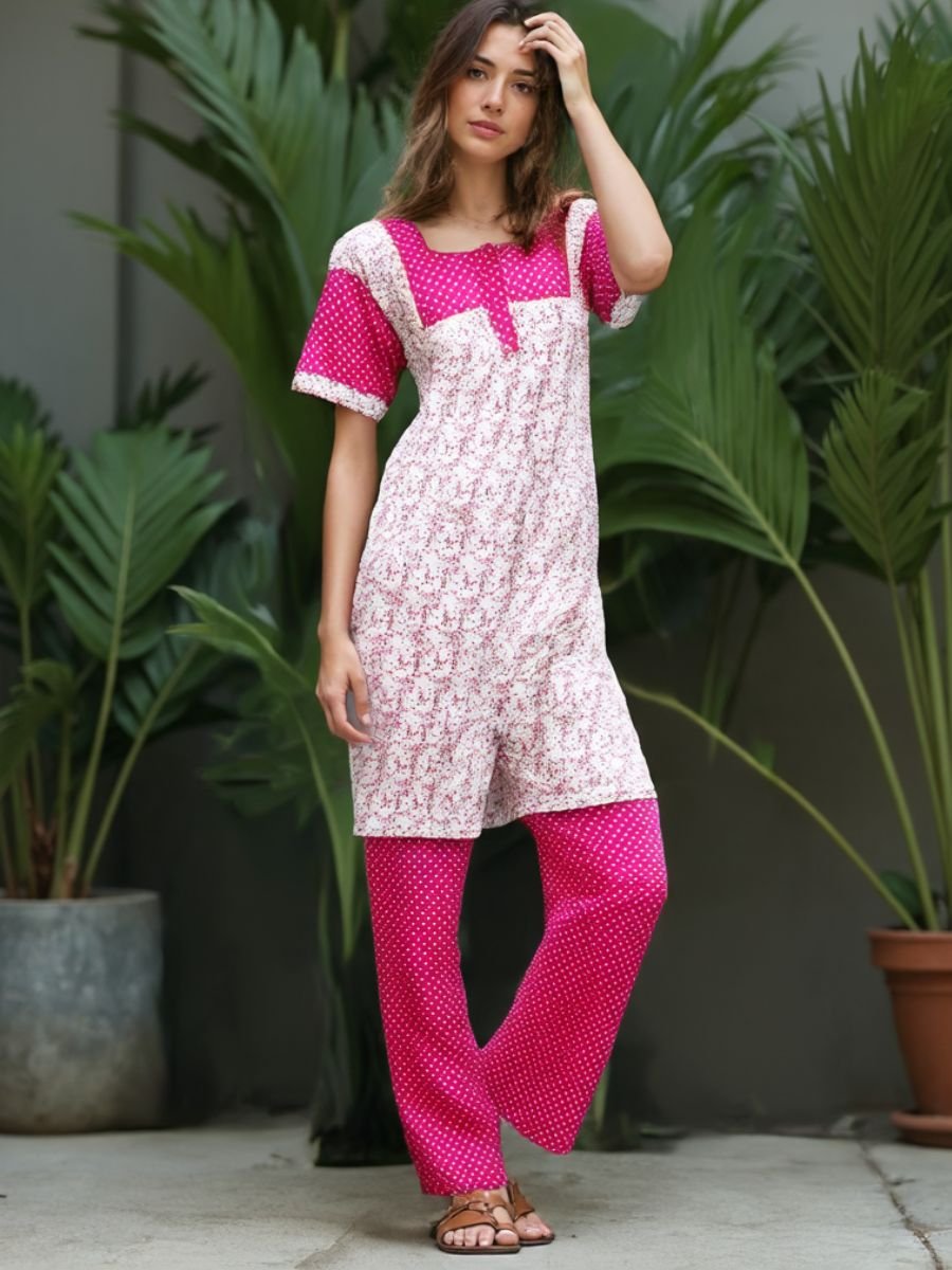 women cotton night suit, cotton pajama set for women, dotted print nightwear, Raspberry cotton nightwear, women’s night dress set, sleepwear set for women, cotton night dress combo, breathable cotton night suit, comfy cotton pajama