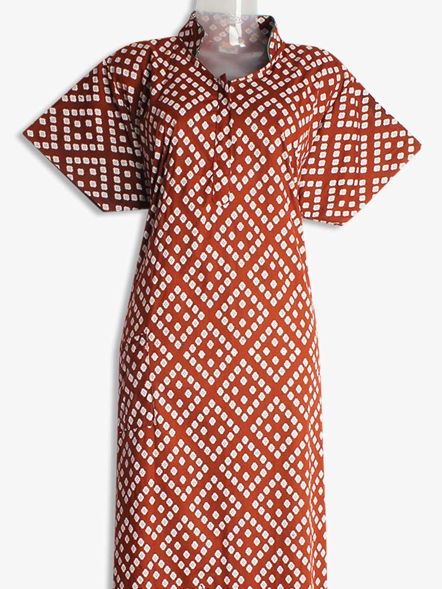 Elevate your nightwear collection with this maroon cotton nighty, designed for ultimate comfort and elegance. Made from 100% breathable cotton, this full-length nightdress features a classic collar neckline, a convenient front zipper for easy wear, and a side pocket for added functionality. The relaxed fit ensures all-night comfort, making it an ideal choice for daily sleepwear or lounging.