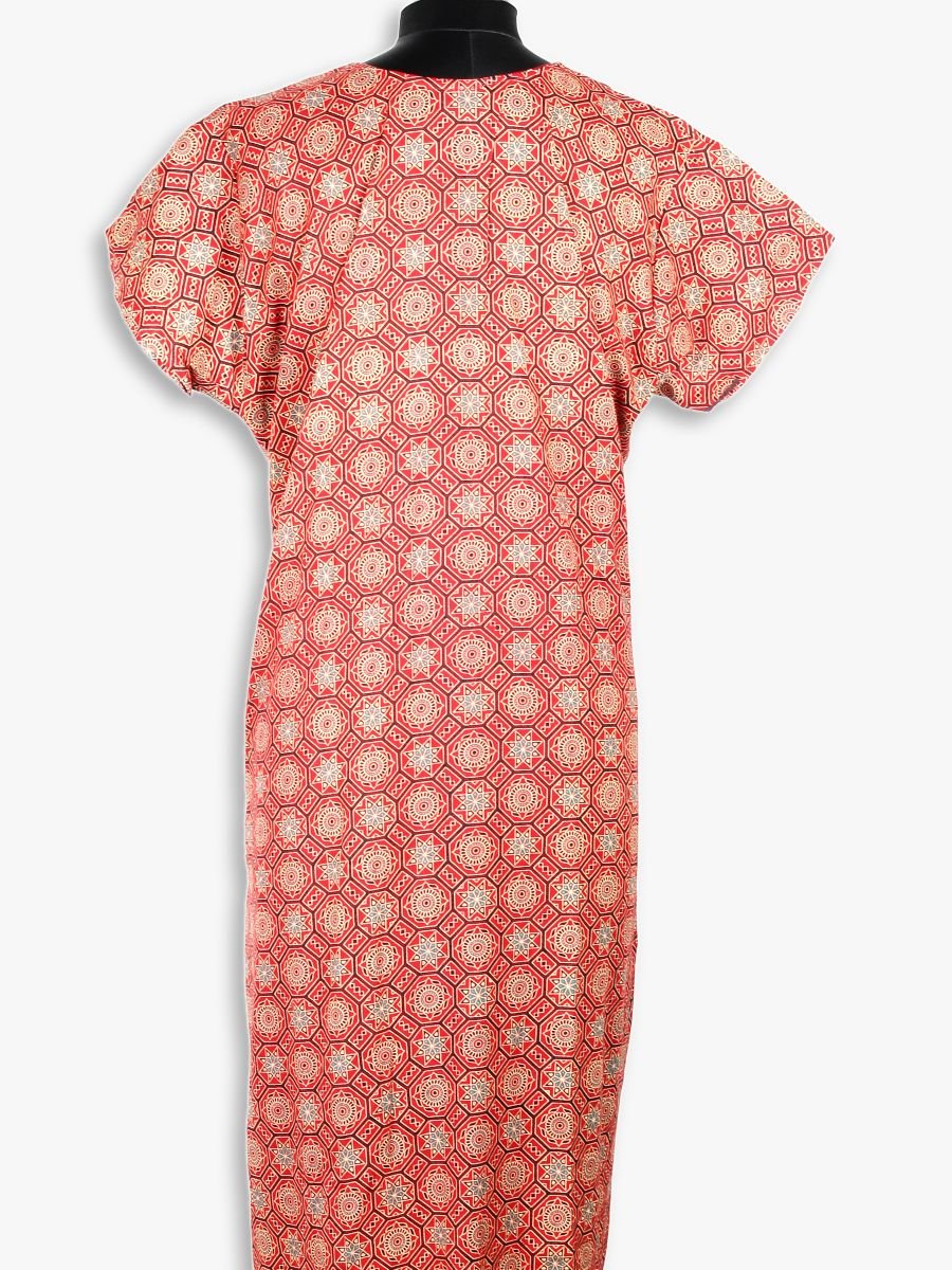 ajrakh cotton nighty, cotton nighty for women, printed cotton night dress, front zip cotton nighty, side pocket nighty, ajrakh nightwear, cotton nighty with zipper, traditional cotton nighty, daily wear night dress, ethnic print nighty for women