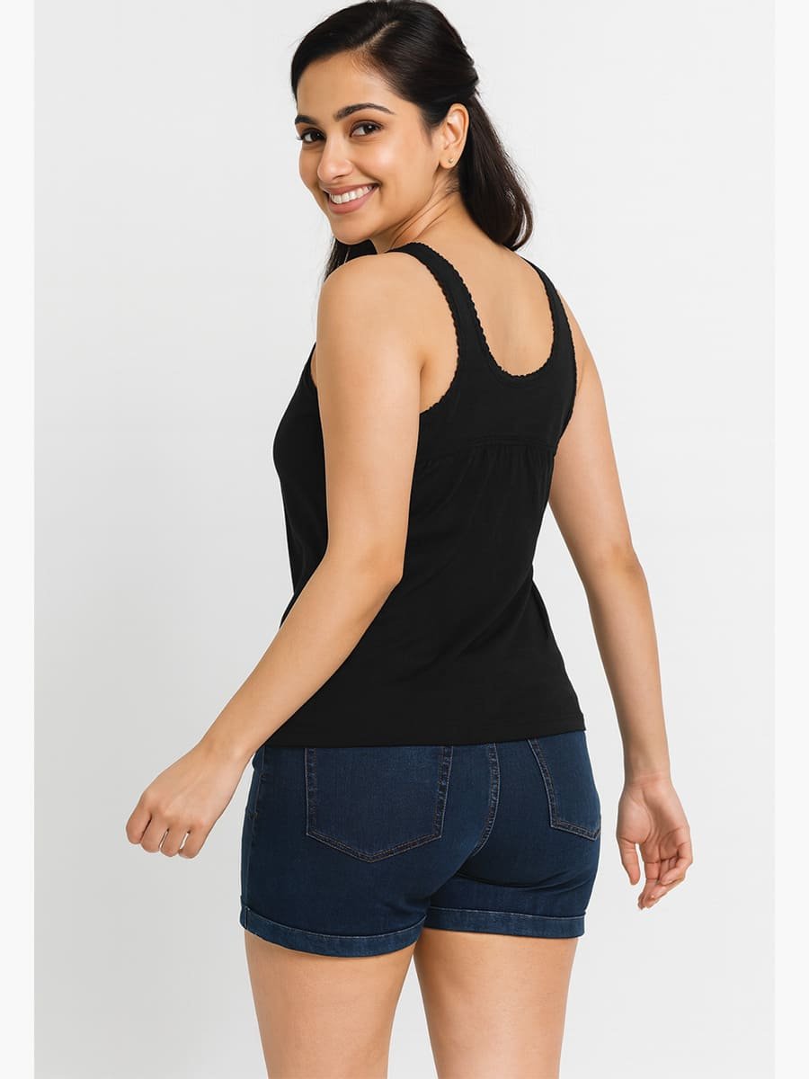 Relax in breathable comfort with our Black Cotton V-Neck Camisole Top. Designed for effortless lounging or bedtime wear, this sleeveless cami features a flattering V-neckline with subtle gathers at the bust for added shape. Made from a soft cotton-stretch blend, it offers a close-yet-comfy fit that’s perfect for warm nights or casual layering under outerwear.
