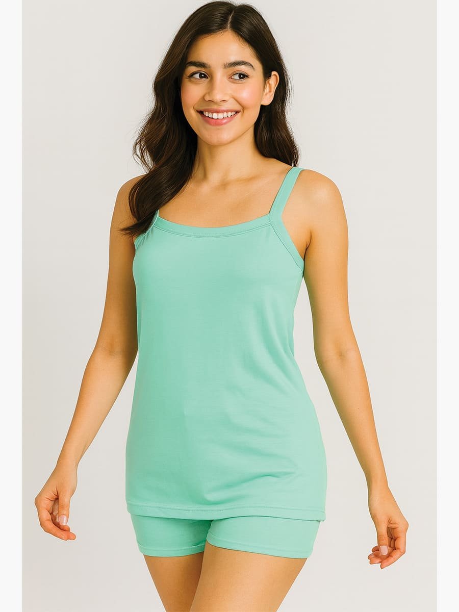Elevate your everyday essentials with our Soft Mint Green Cotton Camisole Top. Made from a soft cotton-spandex blend, this slim-fit cami features fixed spaghetti straps and a clean scoop neckline. Perfect for layering under shirts or pairing with high-waisted jeans, its breathable fabric and smooth finish make it a go-to for warm weather and lounge wear alike.