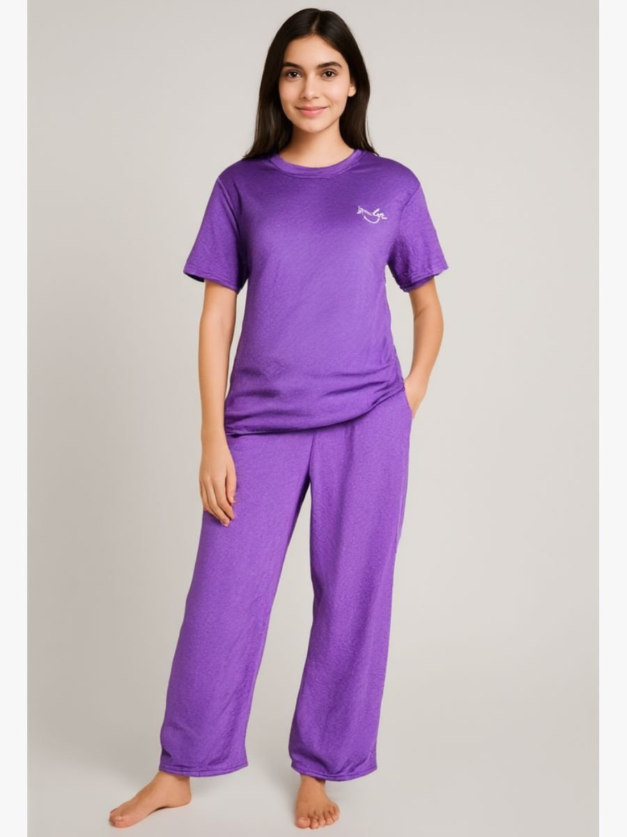 violet cotton night suit, women’s cotton crepe nightwear, cotton pajama set for women, soft nightwear set, violet loungewear set, breathable sleepwear for women