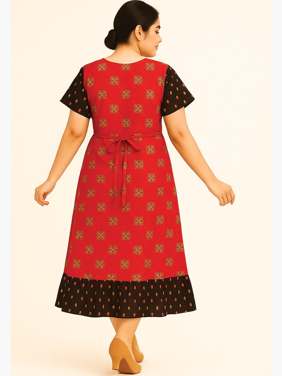 Stay effortlessly stylish and comfortable with this Women’s Cotton Printed Frock Nighty in Red & Black. Made from premium soft cotton, this elegant long nighty features a flared hemline, contrast printed sleeves, and a ruffle border for a trendy touch. Perfect for everyday wear, lounging, or bedtime comfort. The breathable cotton fabric ensures a cool and relaxed feel throughout the night.