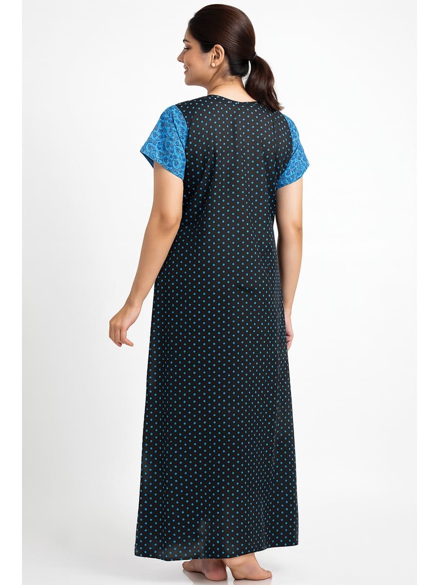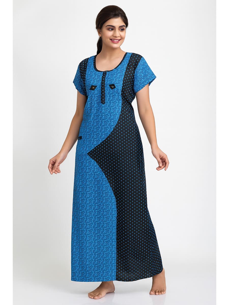 Relax in style with this women’s cotton full-length nighty in blue and black, designed for ultimate nighttime comfort. Made from soft, breathable cotton, this night suit features a flattering round neck, buttoned placket, and a striking mixed print design—blue textured patterns paired with black polka dots for a modern twist. Whether you’re unwinding after a long day or getting ready for bed, this nighty offers comfort, coverage, and a touch of elegance.
