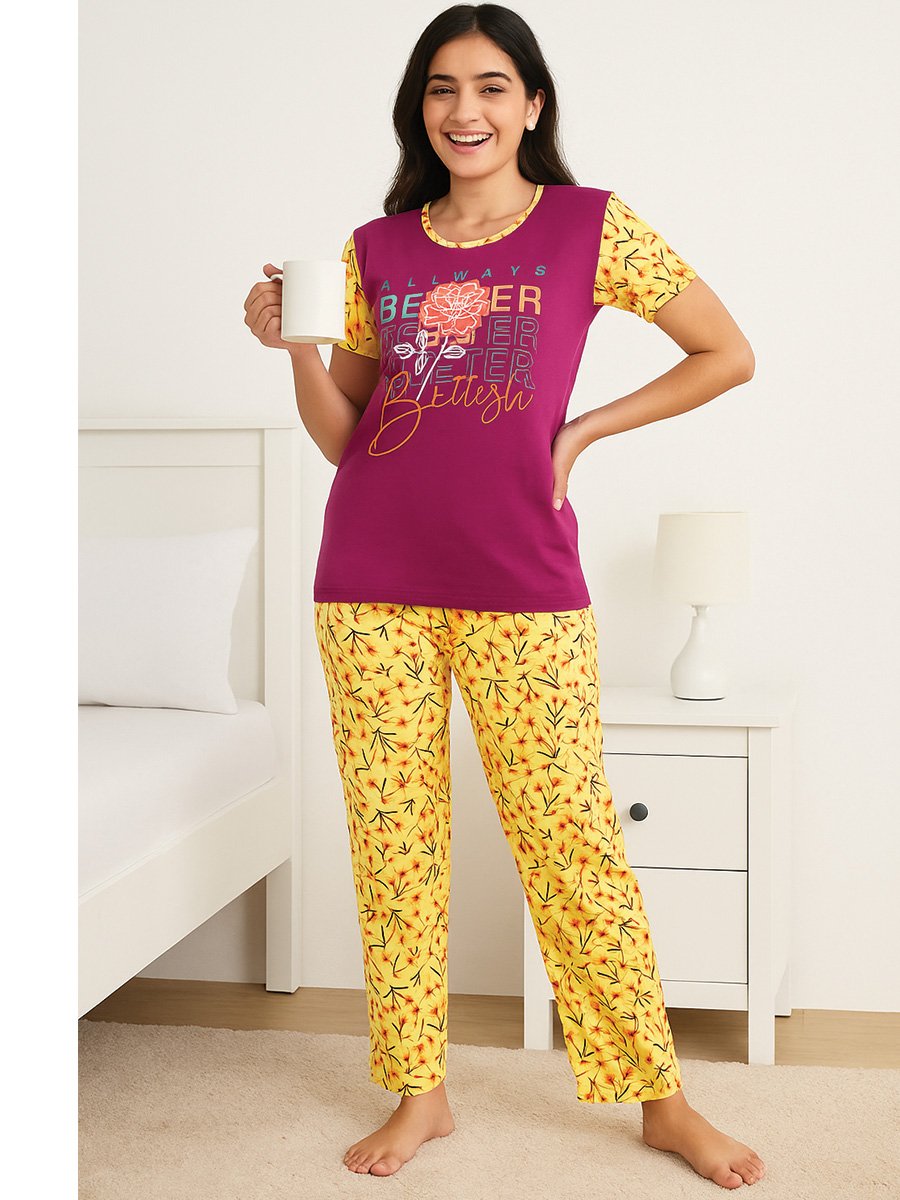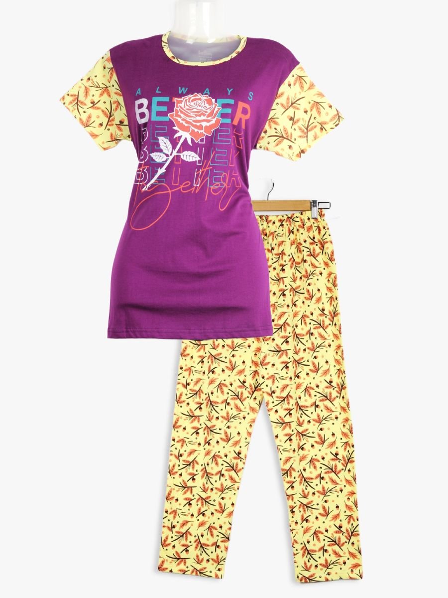 women cotton pajama set, Purple , Yellow pajama set, ladies cotton sleepwear, printed cotton nightwear, cotton night suit for women, women loungewear set, pajama combo for women, stylish cotton sleep set