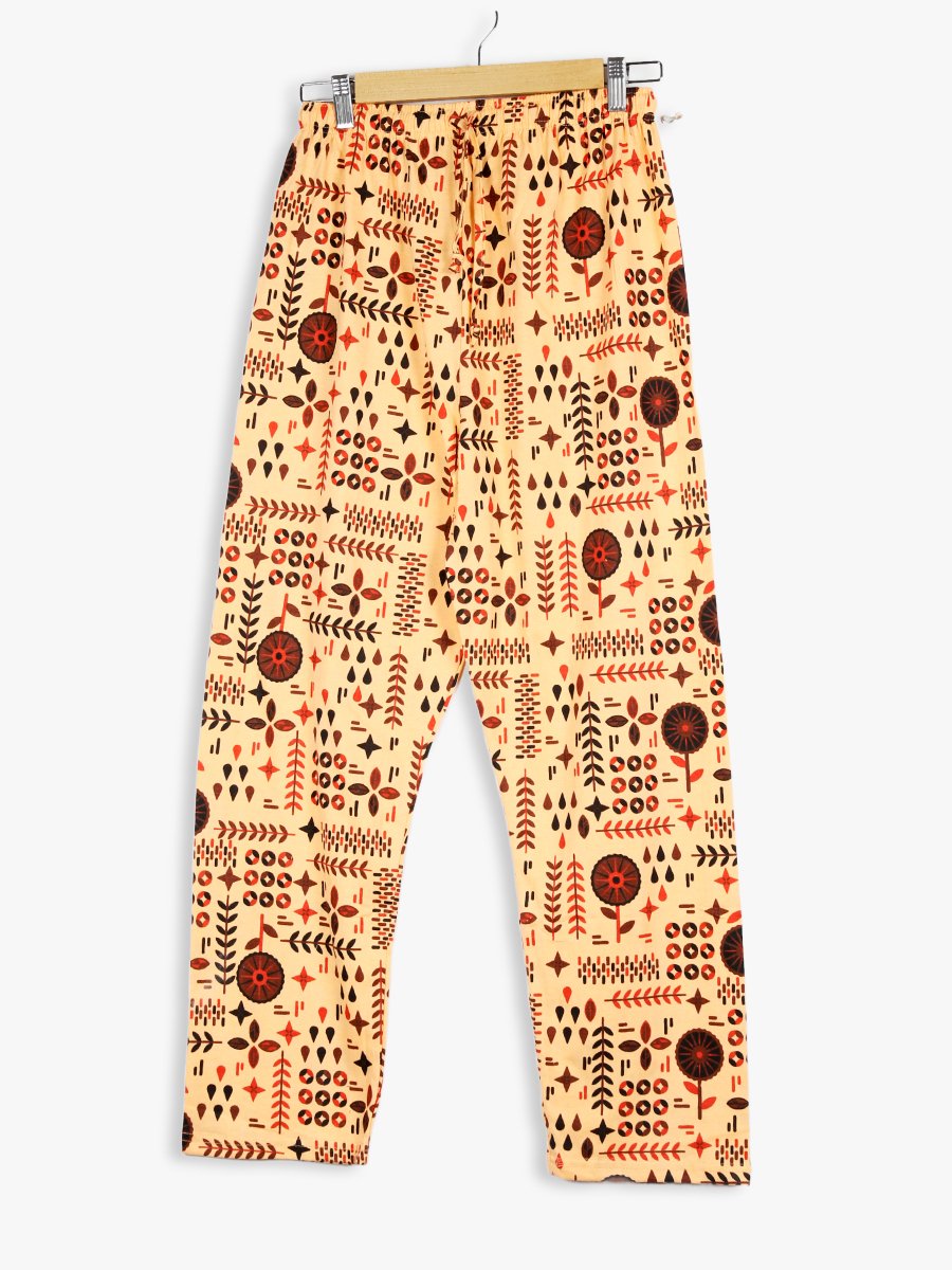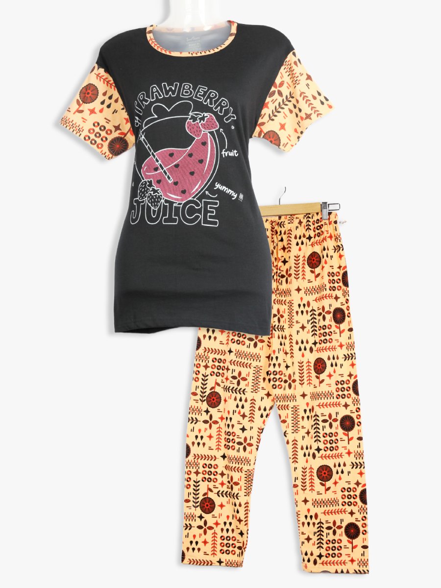 Elevate your everyday nightwear with this stylish and comfy women’s cotton pajama set. The soft Black top pairs beautifully with the Peach printed bottom, creating a charming contrast that’s both playful and relaxing. Made from breathable cotton, this set is ideal for warm nights and cozy lounging.