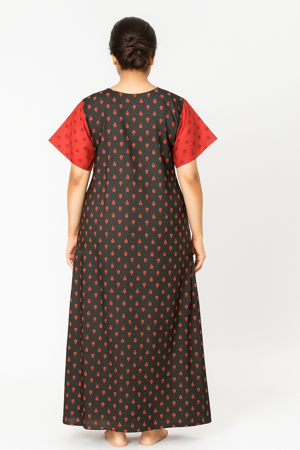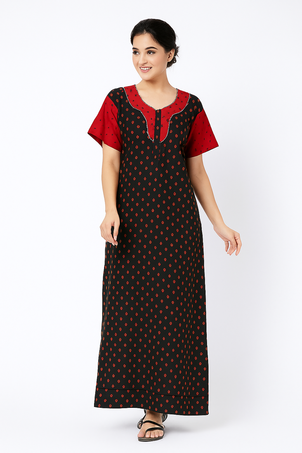 Experience comfort and elegance with this Women’s Cotton Printed Nighty in black and red. Made from breathable 100% pure cotton fabric, it ensures all-day ease and a relaxed fit. The contrasting red yoke and sleeves add a stylish touch, while the soft fabric keeps you cool and comfortable. Perfect for daily wear, lounging, and bedtime comfort, this nighty combines traditional charm with a modern design that flatters every body type.