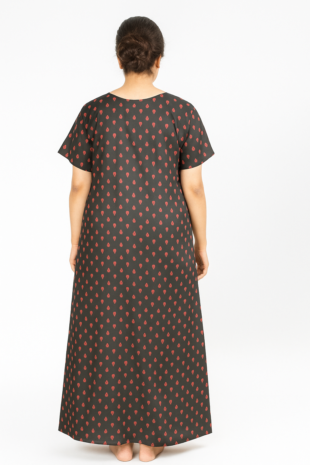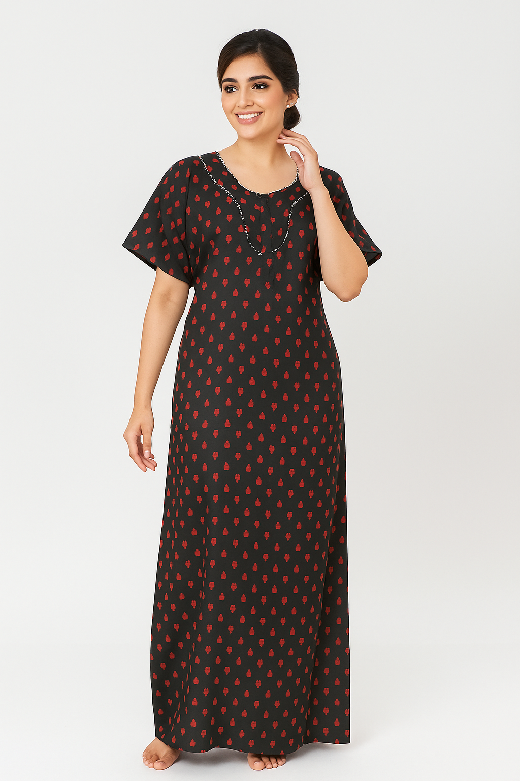 Experience comfort and elegance with this Women’s Cotton Printed Nighty in black . Made from breathable 100% pure cotton fabric, it ensures all-day ease and a relaxed fit. The contrasting red yoke and sleeves add a stylish touch, while the soft fabric keeps you cool and comfortable. Perfect for daily wear, lounging, and bedtime comfort, this nighty combines traditional charm with a modern design that flatters every body type.