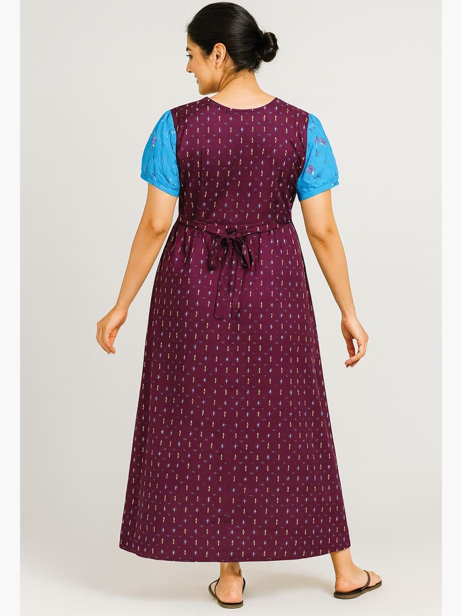 Stay comfortable and stylish with this Women’s Cotton Printed Nighty in Burgundy, crafted from soft, breathable 100% cotton fabric for all-day freshness. Designed with a contrasting Sky Blue printed yoke and cute puff sleeves, this nighty combines traditional charm with a modern touch. The long, flowy silhouette and all-over mustard print make it perfect for daily home wear, relaxed evenings, or casual lounging.