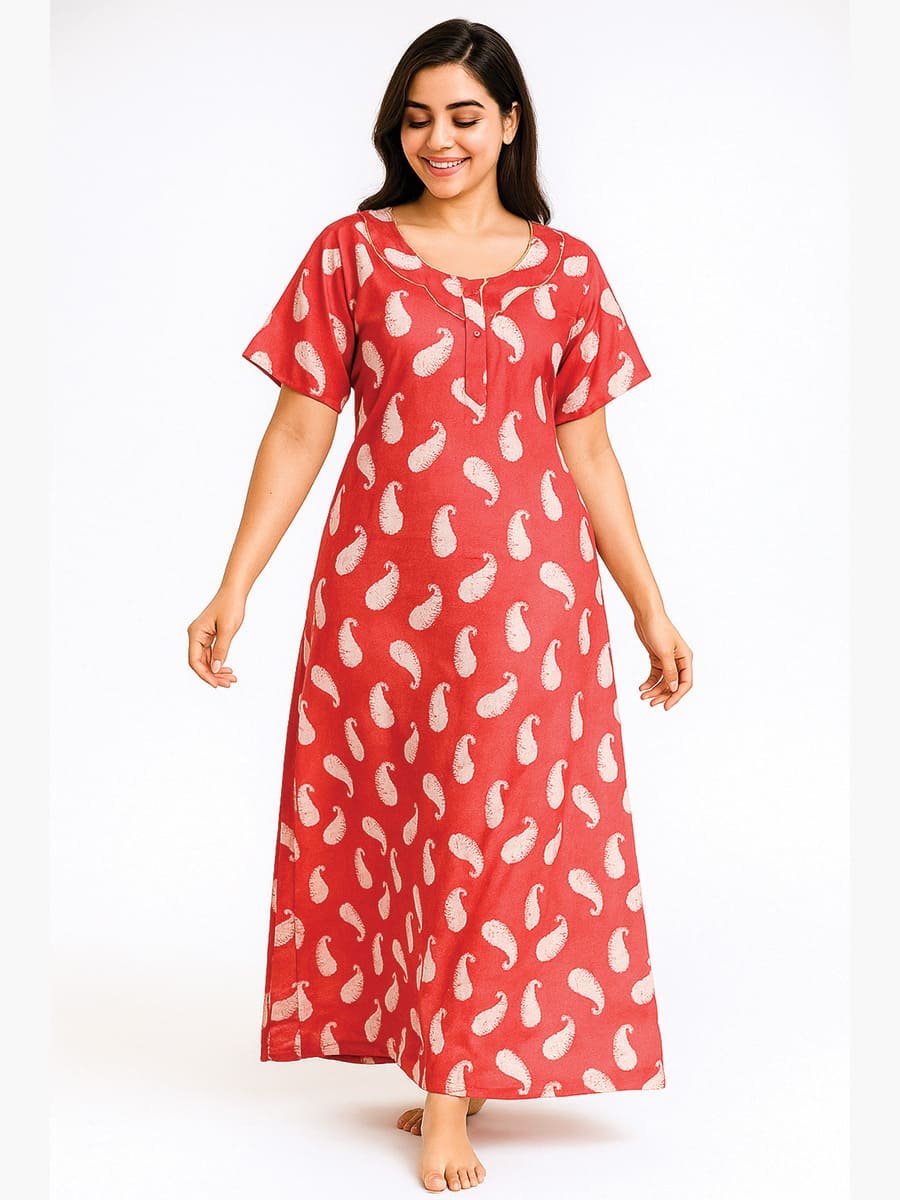 Experience comfort and elegance with this Women’s Cotton Printed Nighty in Coral. Made from breathable 100% pure cotton fabric, it ensures all-day ease and a relaxed fit. The contrasting red yoke and sleeves add a stylish touch, while the soft fabric keeps you cool and comfortable. Perfect for daily wear, lounging, and bedtime comfort, this nighty combines traditional charm with a modern design that flatters every body type.