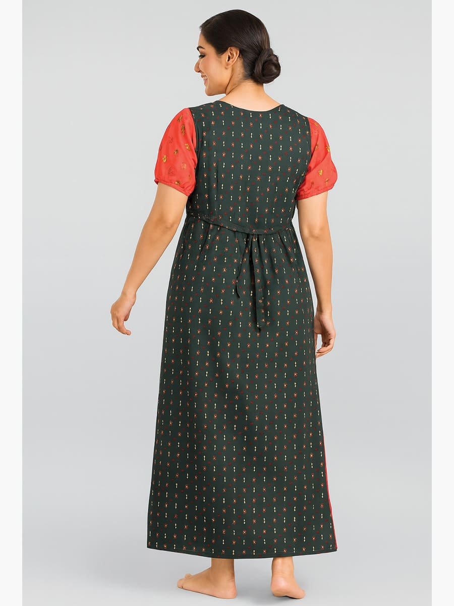 Stay comfortable and stylish with this Women’s Cotton Printed Feeding Nighty in Olive Green, crafted from soft, breathable 100% cotton fabric for all-day freshness. Designed with a contrasting Cerise printed yoke and cute puff sleeves, this nighty combines traditional charm with a modern touch. The long, flowy silhouette and all-over mustard print make it perfect for daily home wear, relaxed evenings, or casual lounging.