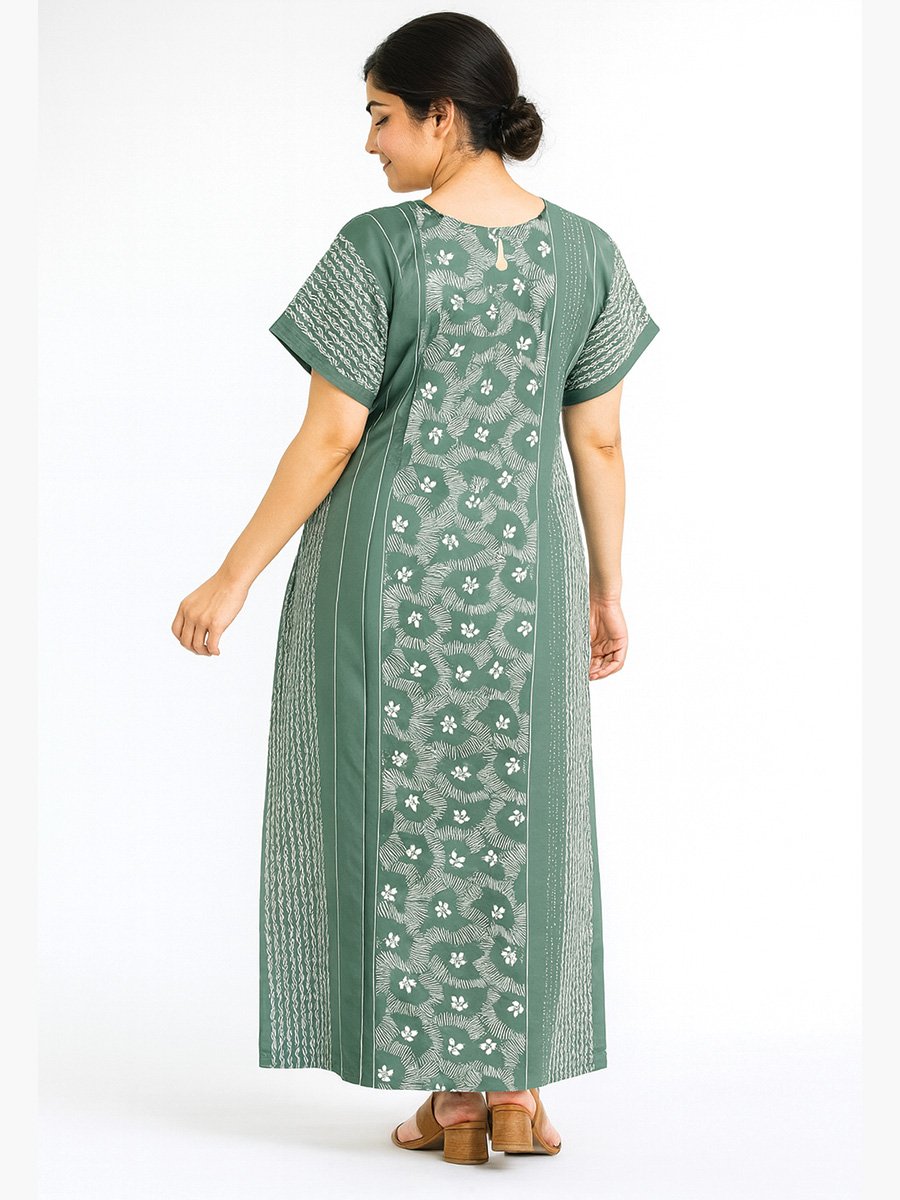 Experience all-day comfort with this Women’s Cotton Printed Seafoam Green Long Nighty, crafted from soft and breathable cotton fabric. Designed with a traditional yet stylish all-over floral print, this nighty offers a relaxed fit perfect for daily wear, home wear, or bedtime. The lightweight cotton ensures comfort in all seasons, while the side slits provide ease of movement. Ideal for women