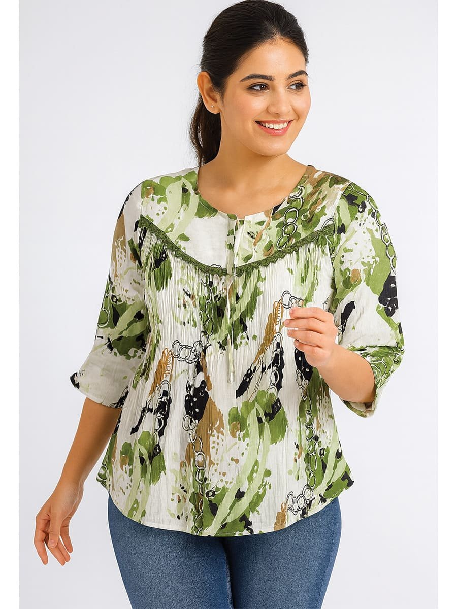 Refresh your wardrobe with this Women’s Popcorn Printed Tunic Top in Olive Green. Made from breathable Popcorn , it offers a relaxed fit with 3/4th sleeves and a round neckline. The abstract print gives a trendy, artistic look—perfect for both office wear and casual outings. Pair it with jeans, trousers, or leggings for a chic and comfortable everyday style.