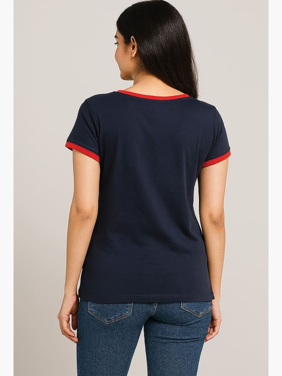 Keep it casual and effortlessly stylish with this Navy Blue Cotton Ringer T-Shirt, designed with classic red contrast trims at the neckline and sleeves. The front features a cute embroidered heart patch, adding a playful touch to this timeless style.