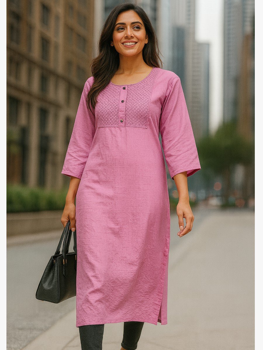 Add a touch of elegance to your everyday ethnic wear with this Dusty Pink cotton straight kurta for women. Designed with a round neck, 3/4th sleeves, and a finely embroidered yoke panel, this kurta combines simplicity with subtle charm. Made from soft and breathable cotton, it ensures all-day comfort whether you’re at work, home, or out for errands. The buttoned front adds a stylish finish, while the straight hem makes it ideal to pair with leggings, palazzos, or pants.