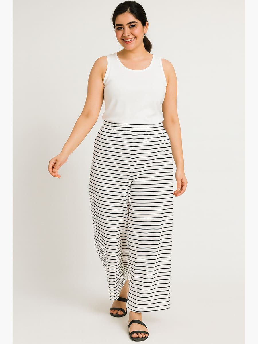 Step into effortless comfort with these Women’s Cotton Striped Culotte Pants in a chic White hue. Designed with a relaxed wide-leg silhouette, elastic waistband, and soft breathable cotton fabric, these pants are perfect for casual outings, travel, and everyday wear. Pair with a tank top or tee for a modern, minimalist look.