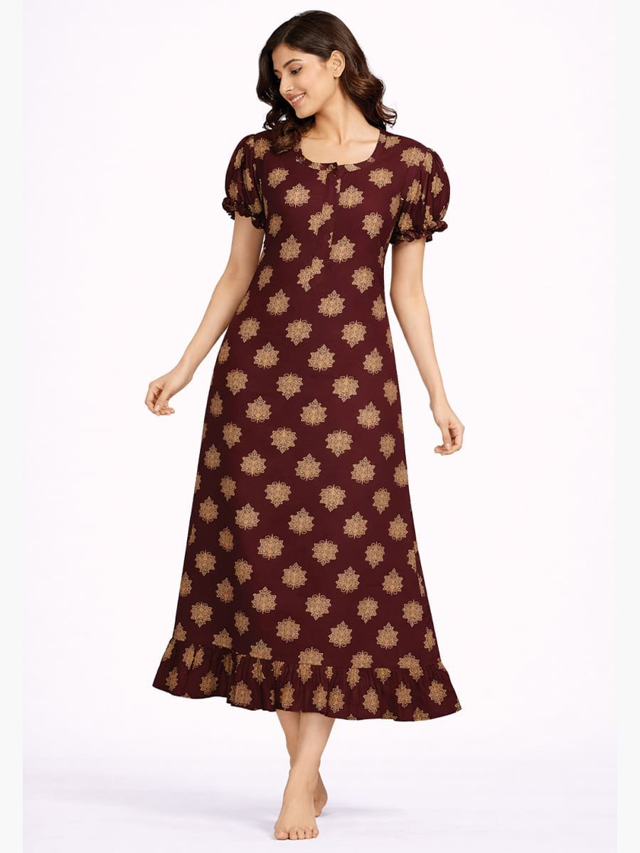 Experience everyday comfort with this women’s cotton floral zipper frock nighty, thoughtfully designed for ease and practicality. Made from soft, breathable cotton fabric, this frock nighty features a beautiful all-over floral print and buff hand sleeves for a graceful look. The front zipper closure offers convenience and ease of wear, making it ideal for daily use. Its flared frock-style silhouette ensures relaxed movement, perfect for lounging, sleeping, and all-day comfort at home.