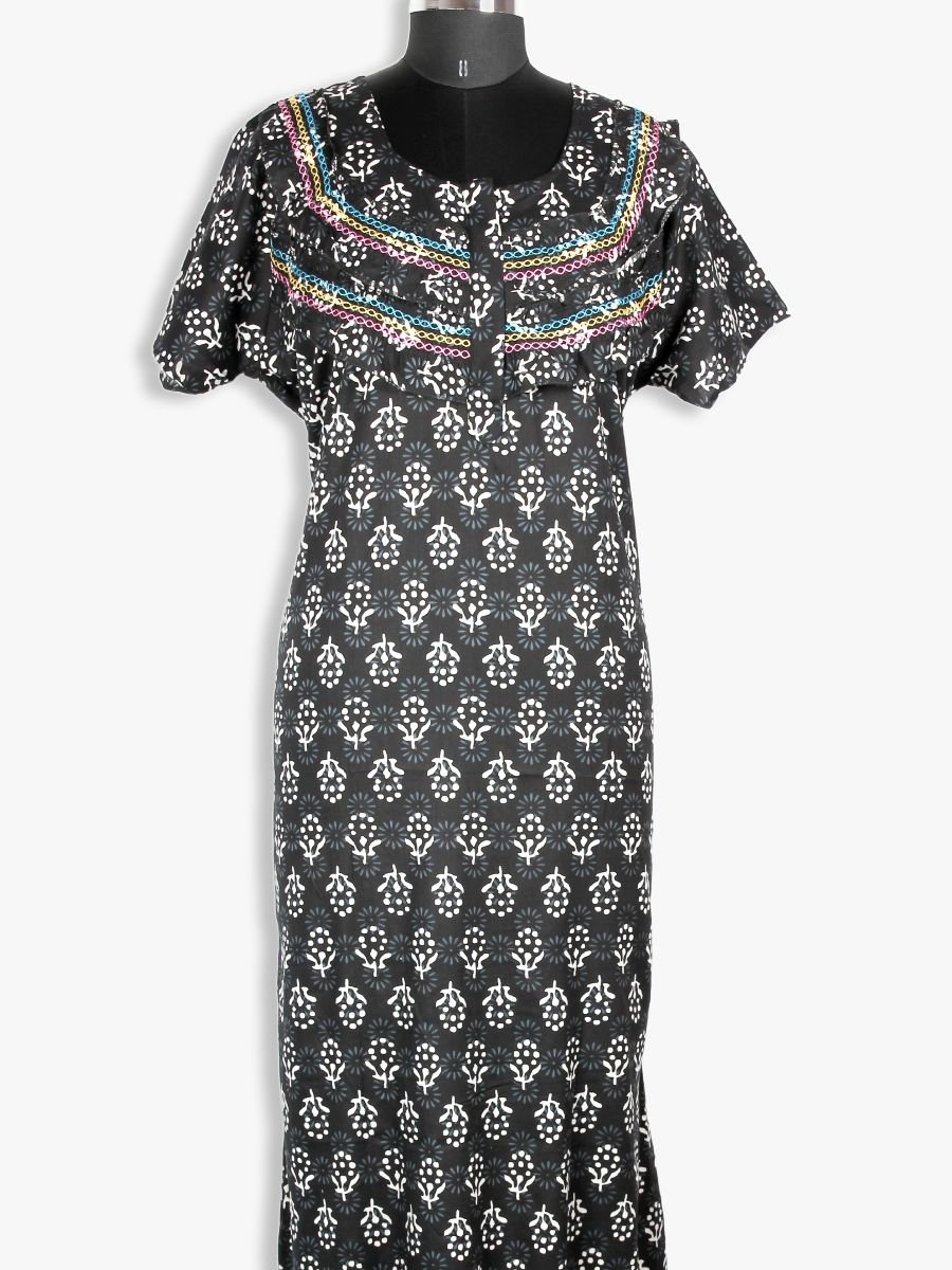 cotton nighty for women, double frill cotton nighty, black cotton night dress, cotton nighty with zipper, front zip cotton nighty, frill nighty design, women’s nightwear cotton, soft cotton nighty for ladies, daily wear cotton nighty, stylish cotton nighty