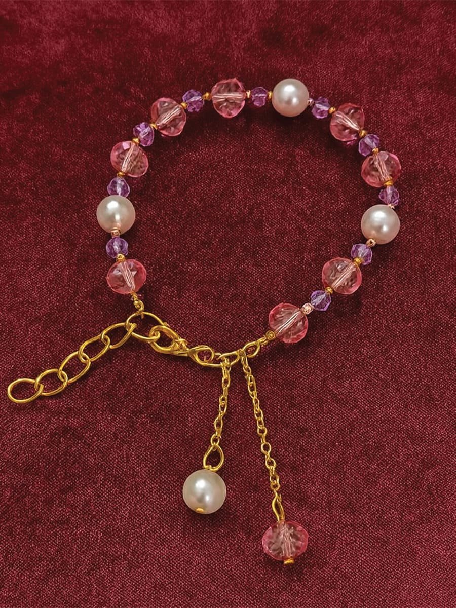 Add elegance to your style with this women’s crystal bracelet crafted from a mix of pink and violet crystal beads, shimmering white pearls, and golden sugar beads. Accented with a delicate gold chain extender and charming dangles, this bracelet offers both sophistication and versatility. Perfect for pairing with traditional or western outfits, it’s an ideal choice for partywear, festive looks, or gifting.