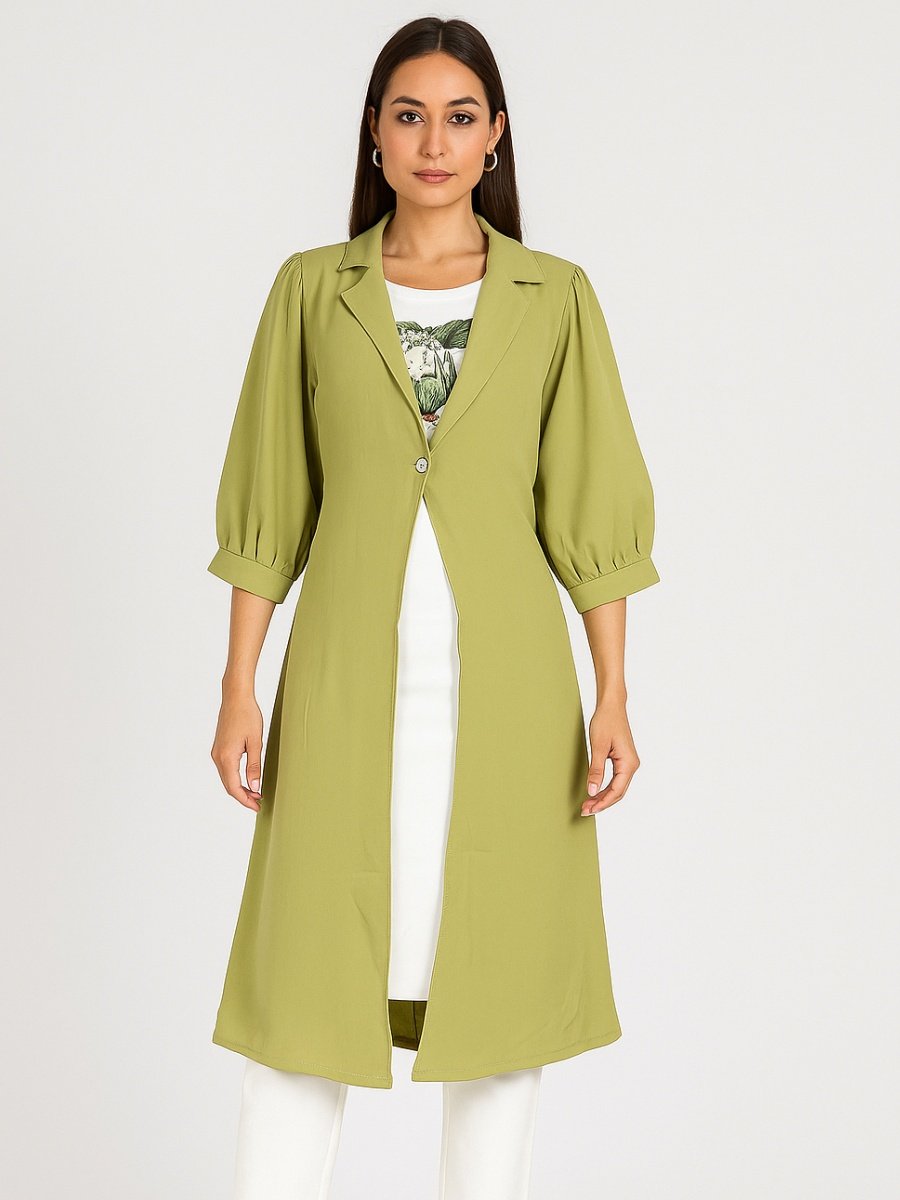 Elevate your layering game with this elegant Olive Green Longline Shrug, crafted to add sophistication to your everyday and semi-formal looks. Featuring a flattering lapel collar, single-button closure, and trendy puff 3/4th sleeves, this shrug exudes effortless charm. Its soft rayon-blend fabric ensures all-day comfort while the open front makes it easy to pair with tanks, tees, or dresses. Ideal for workwear, brunches, or casual evenings out.
