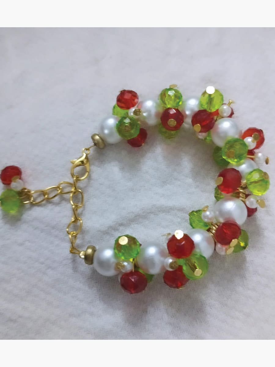 A vibrant women’s bracelet featuring red, green, and white crystal beads with lustrous pearls and golden accents. Designed with a secure gold fish lock and extender, this floral-style bracelet adds a festive and elegant touch. Perfect for weddings, parties, and casual wear. Keywords: floral bracelet, pearl crystal bracelet, multicoloured bracelet.
