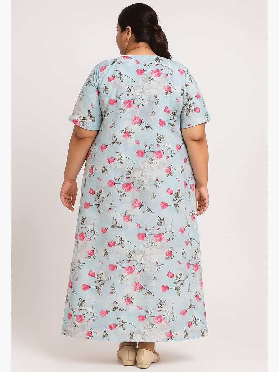 Upgrade your daily comfort with this Women’s Rayon Floral Printed Nighty in Sky Blue, designed for plus-size women who love breathable, soft, and lightweight sleepwear. Made from premium rayon fabric, this nighty offers a smooth drape, gentle feel on the skin, and all-day comfort. The elegant pink and white floral print, short sleeves, and round neckline make it perfect for summer nights, lounging, and daily home wear. Ideal for women looking for comfortable nightwear, plus-size nighty, and rayon long nightgowns.