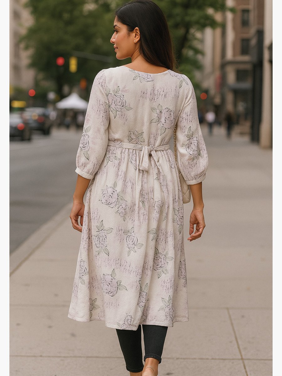 Elevate your everyday look with this elegant women’s popcorn fabric A-line dress in a soft white floral print. Designed for both comfort and charm, this midi-length dress features a flattering tie-waist, round neckline, and button-down front. Perfect for casual outings, brunch dates, or workwear, this breathable and lightweight popcorn dress brings effortless grace to your wardrobe. The su