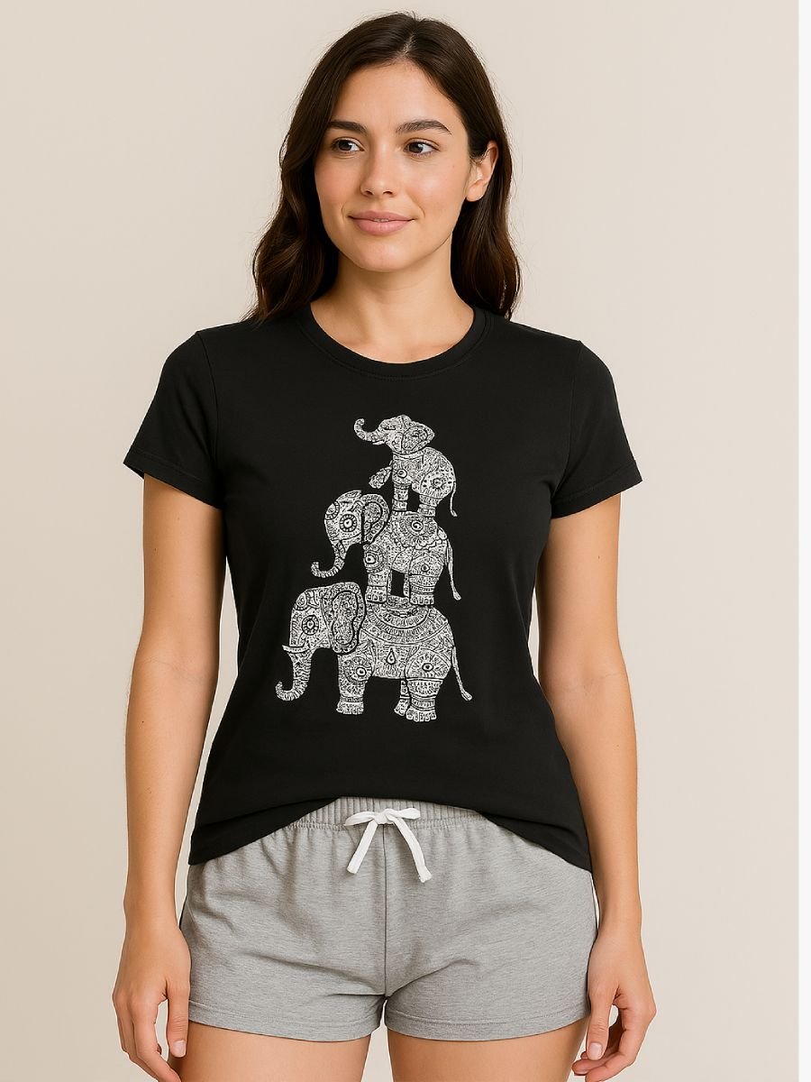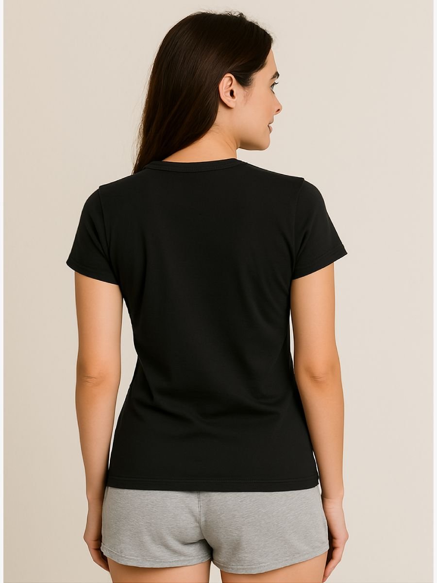 women’s black cotton t-shirt, printed cotton t-shirt for women, casual black t-shirt, women’s graphic tee, breathable cotton tee, black round neck t-shirt, soft cotton t-shirt for ladies, stylish printed t-shirt women