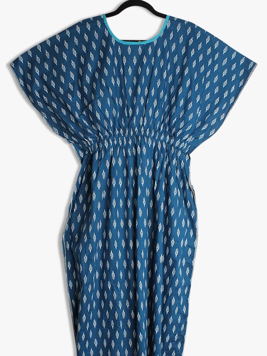 Stay effortlessly stylish and comfortable with this navy blue cotton kaftan nighty. Crafted from 100% breathable cotton, this kaftan-style nightdress offers a relaxed fit, making it perfect for both lounging and sleeping. The scoop neckline enhances its modern appeal, while the wide sleeves and flowy silhouette provide unrestricted movement. Whether you’re looking for a comfortable sleepwear option or a chic loungewear piece, this cotton kaftan nighty is an ideal choice.