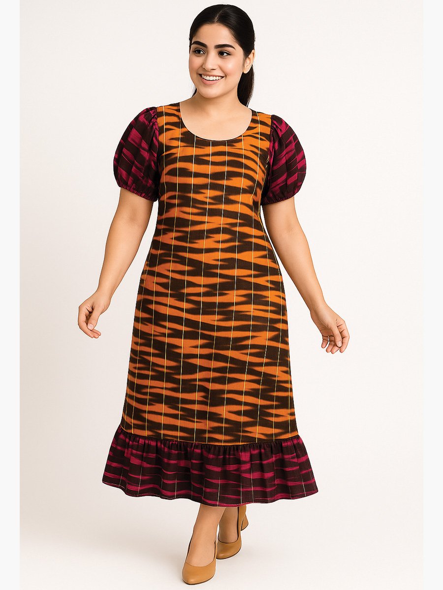 Experience all-day comfort with this Women’s Rayon Frock Model Nighty designed in a vibrant Musturd Yellow ikat pattern with contrasting maroon puff sleeves. Crafted from soft, breathable rayon, this nighty offers a smooth drape, roomy fit, and stylish frock silhouette. Its ruffled hem, modern ikat print, and comfortable sleeve design make it perfect for home wear, lounging, and relaxed outings.