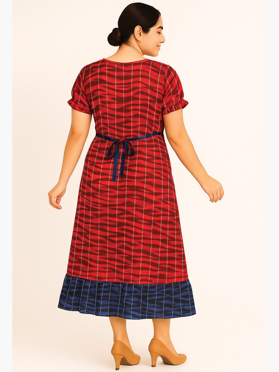 Experience all-day comfort with this Women’s Rayon Frock Model Nighty designed in a vibrant Red ikat pattern with contrasting maroon puff sleeves. Crafted from soft, breathable rayon, this nighty offers a smooth drape, roomy fit, and stylish frock silhouette. Its ruffled hem, modern ikat print, and comfortable sleeve design make it perfect for home wear, lounging, and relaxed outings.