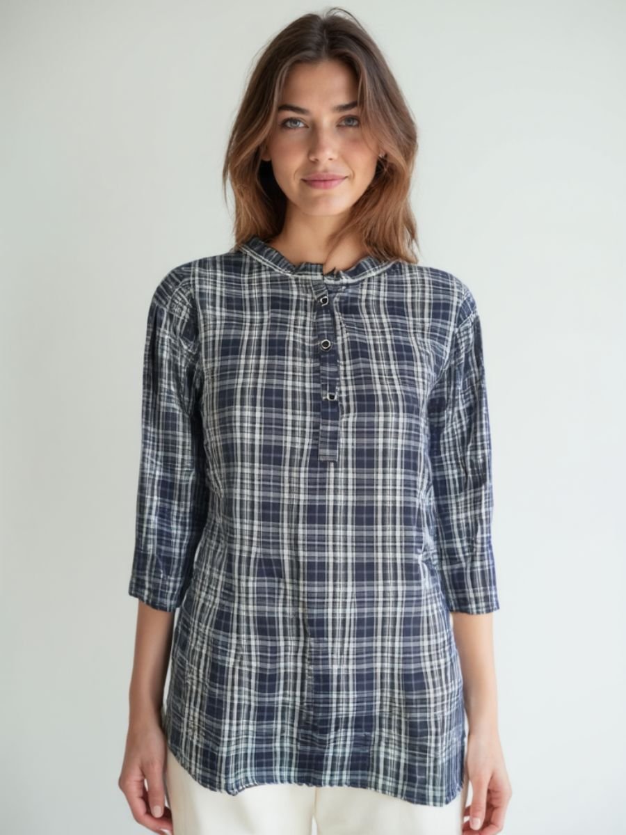 Classic checkered rayon top with a smart button placket and 3/4 sleeves. Comfortable, breathable, and perfect for everyday casual wear.