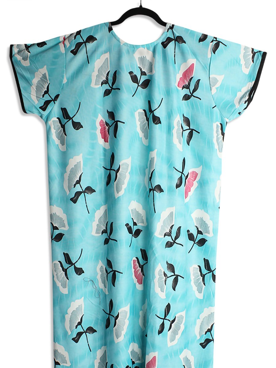 Lycra nighty, floral nightdress, sky blue nightgown, boat neck nightwear, stretchable sleepwear, women’s nightdress, stylish nightwear.