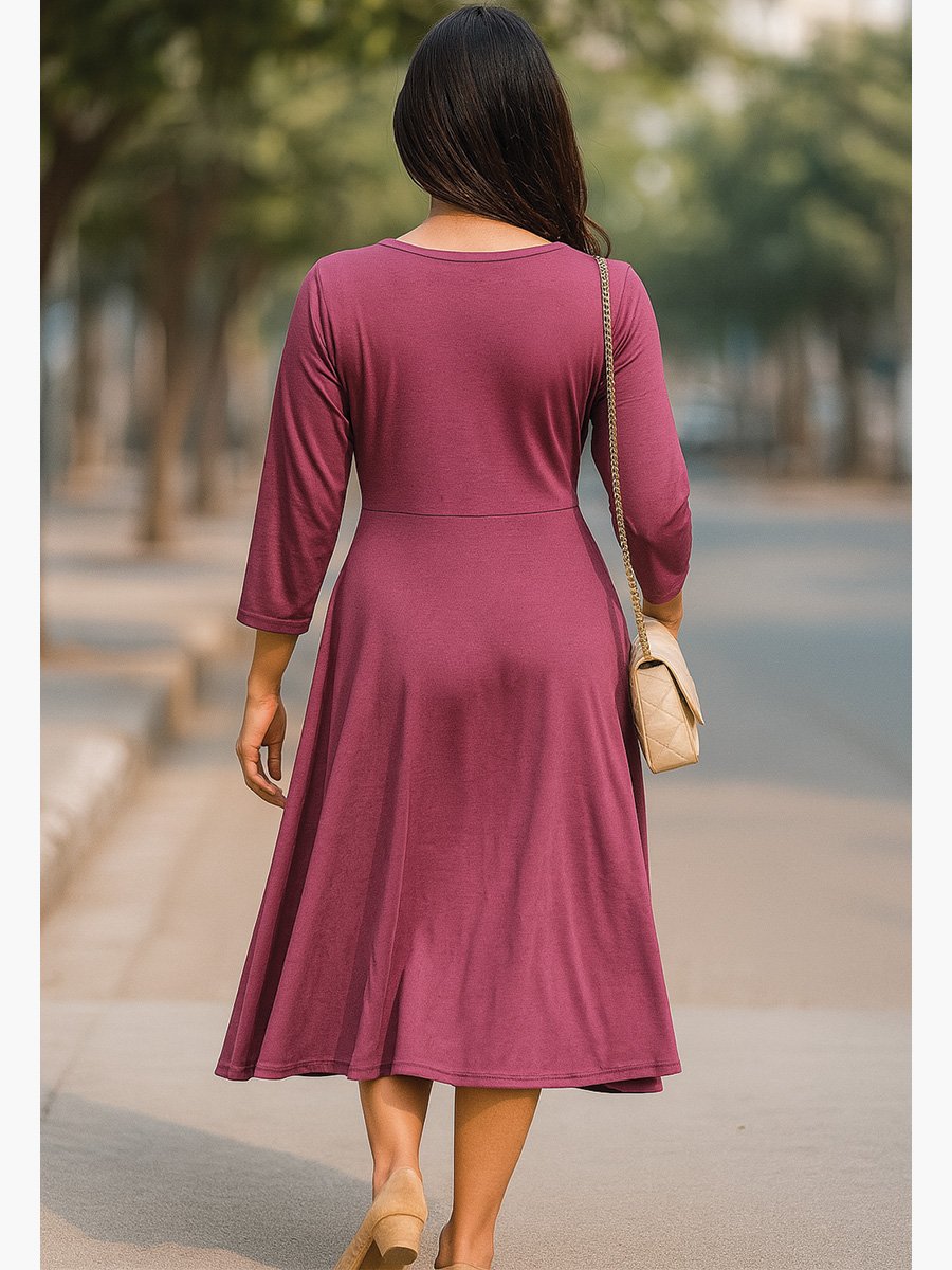 Step into timeless elegance with this classic Rose Pink Satin midi dress for women. Made from soft and breathable Satin fabric, this dress features a flattering V-neckline, smart three-quarter sleeves, and chic button detailing on the front. The solid Rose Pink color makes it a versatile wardrobe essential — perfect for casual wear, office outfits, or an elegant evening look. Style it with heels or flats and minimal accessories for a refined appearance.