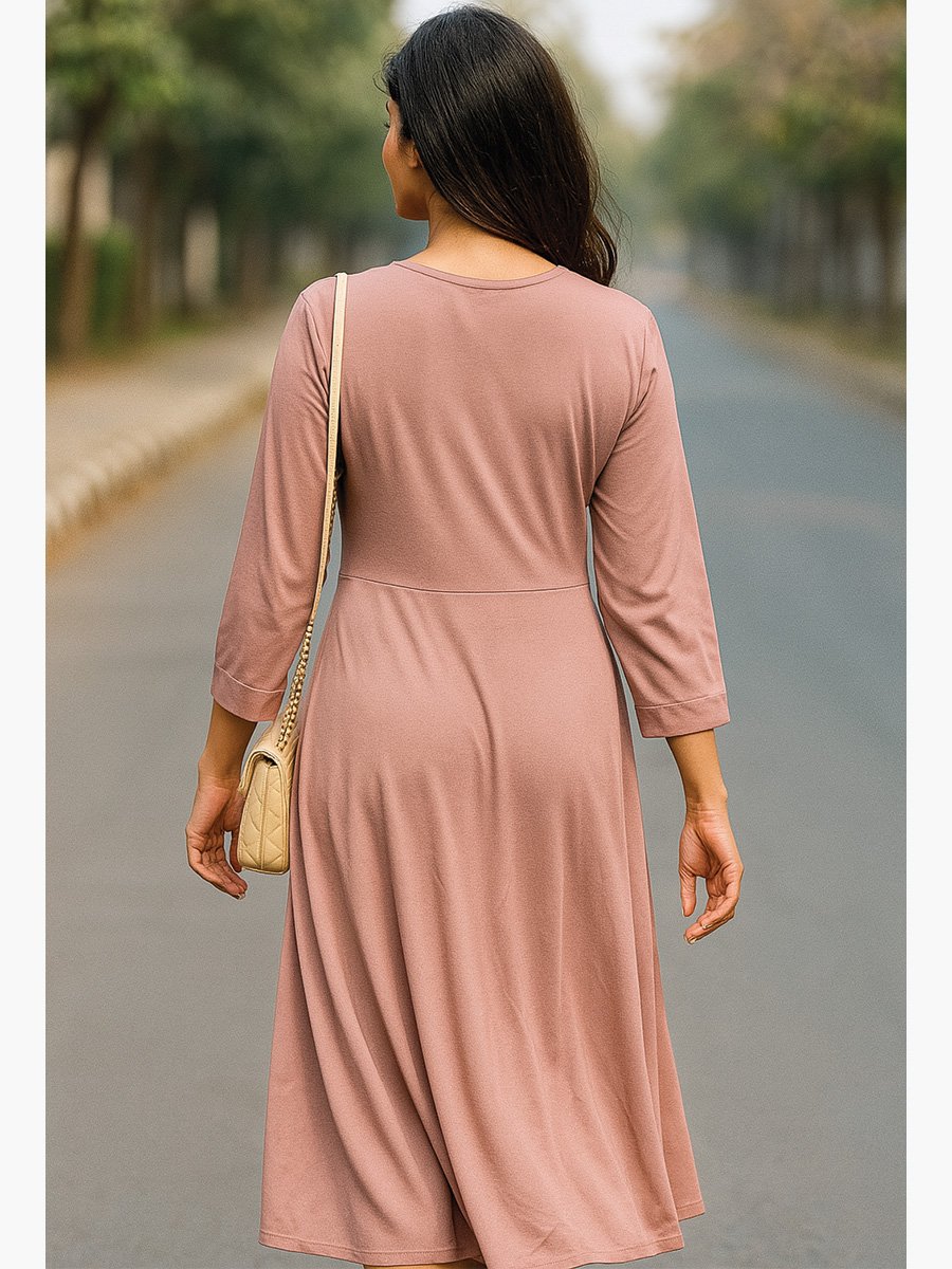 Step into timeless elegance with this classic Terracotta Satin midi dress for women. Made from soft and breathable Satin fabric, this dress features a flattering V-neckline, smart three-quarter sleeves, and chic button detailing on the front. The solid Terracotta color makes it a versatile wardrobe essential — perfect for casual wear, office outfits, or an elegant evening look. Style it with heels or flats and minimal accessories for a refined appearance.