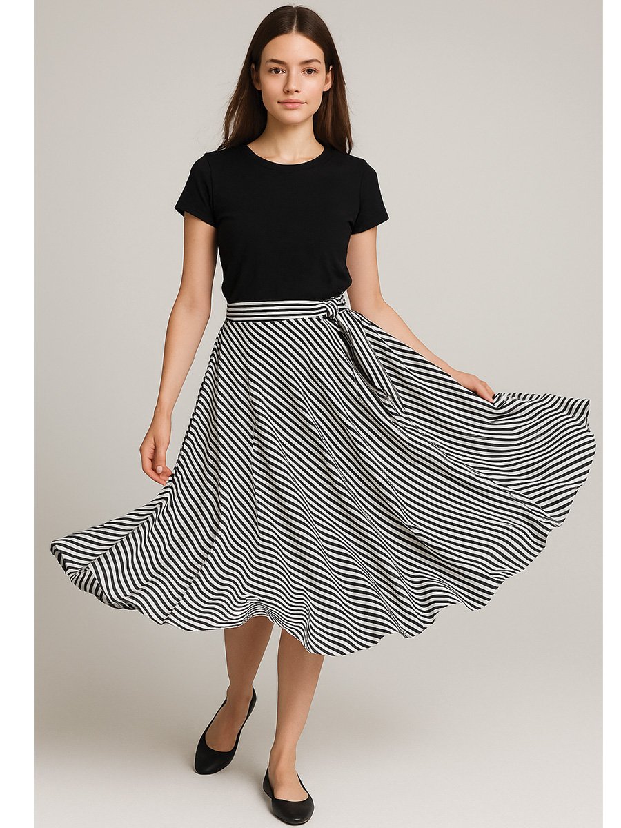 Make a breezy statement with our White & Black Striped Pleated Maxi Skirt. Crafted from soft crepe polyester, this ankle-length skirt features vibrant multicolor stripes, permanent pleats for a flattering silhouette, and a comfortable elastic waistband with an adjustable drawstring tie. Perfect for casual outings, brunch dates, or vacation looks, it pairs effortlessly with solid tops and minimal sandals. The fluid drape and lightweight fabric ensure day-long comfort with elegant flair.