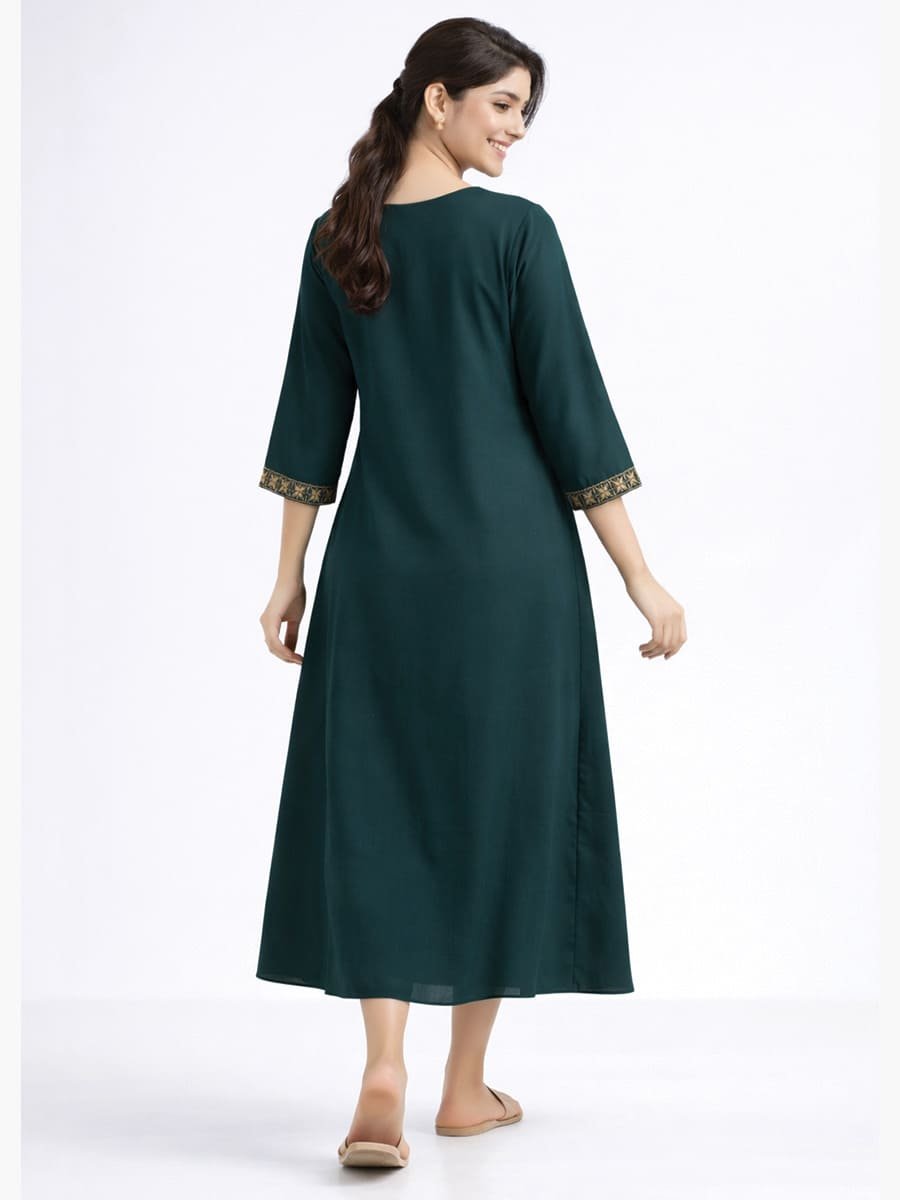 Add graceful elegance to your ethnic wardrobe with this women’s polyester embroidered A-Line Kurta. Crafted from lightweight, flowy polyester fabric, this teal Dress features fine embroidery detailing on the neckline and sleeve borders for a refined festive touch. The straight yet softly flared silhouette, combined with three-quarter sleeves and calf-length design, offers both comfort and sophistication. Ideal for office wear, casual outings, festive gatherings, and evening wear, this kurta pairs beautifully with leggings or palazzos.